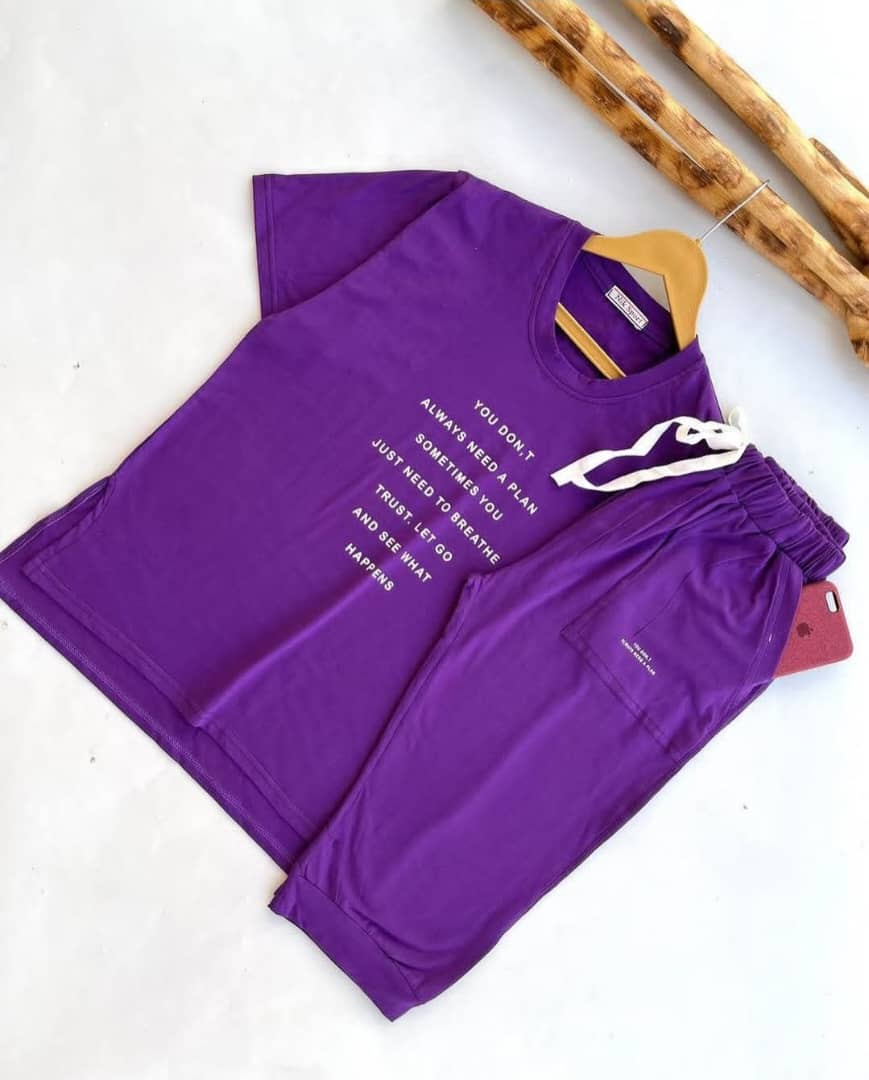 تیشرت این ست با چاپ فونت طراحی شده و ظاهری مینیمال و امروزی دارد؛ سبک و قابل تنفس است و برای استفاده خانه یا دورهمیهای دوستانه کاملاً مناسب است.