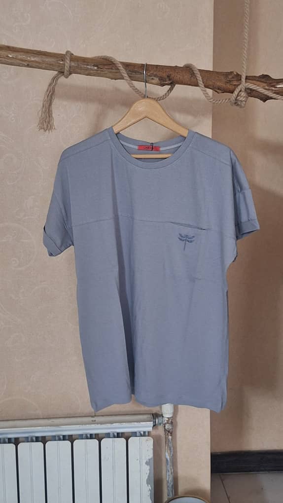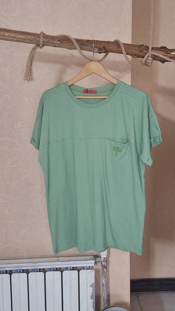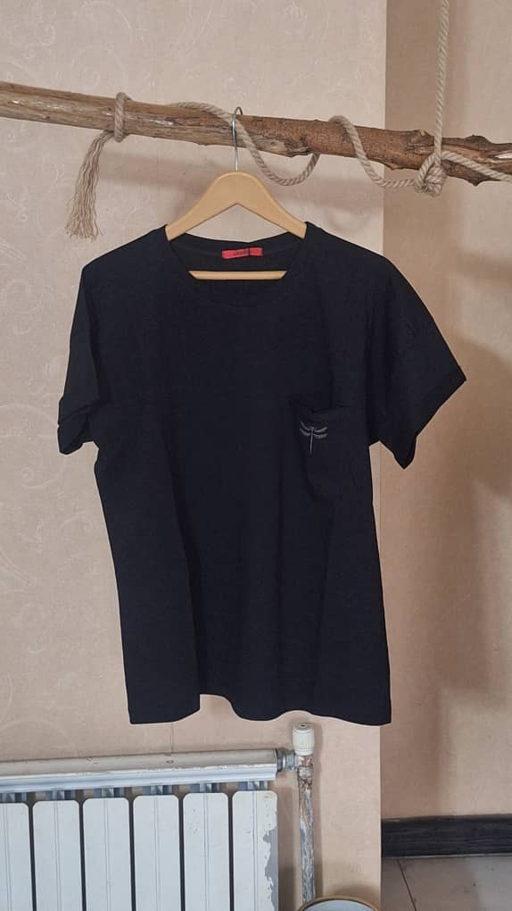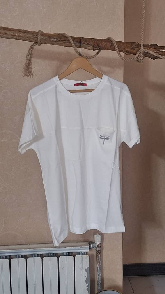 اما بخش جذاب این تیشرت، جیب مخفی روی سینه است که سادگی لباس را حفظ کرده و با گلدوزی سنجاقک ظریف روی جیب، شخصیت ویژهای به آن میدهد مدلی که بهراحتی با شلوار جین، لینن یا حتی دامنهای راحت تابستانی ست میشود.